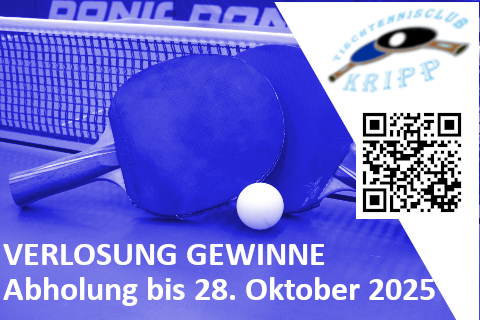 Die Gewinnliste der Verlosung des TTC Kripp ist eingestellt. Die Gewinne können jeweils dienstags von 18.00 - 20.00 Uhr und samstags von 11.00 - 15.00 Uhr bis einschließlich 28. Oktober 2025 abgeholt werden.